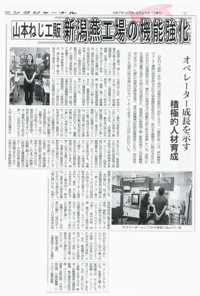 業界紙「ファスニングジャーナル」で新潟燕工場の取り組みが紹介されました! 2025.10.01未分類 ねじ業界の専門紙「ファスニングジャーナル」2025年9月27日号に、新潟燕工場の人材育成に関する取り組みについての記事が掲載されました。 投稿者: 山本ねじ工販 Web担当 未分類 コメント: 0 新潟燕工場に新たに社名看板を設置しました コメント ( 0 ) トラックバック ( 0 ) この記事へのコメントはありません。 この記事へのトラックバックはありません。 トラックバック URL 返信をキャンセルする。 名前 ( 必須 ) E-MAIL ( 必須 ) ※ 公開されません URL Δ 関連記事一覧 テクニカルショウヨコハマ2025に出展しました! 【新潟燕工場】23年度導入設備紹介 店頭販売受付方法変更のご案内 【復旧済】固定電話・FAX回線 不具合のお知らせ 採用ページをリニューアルしました! 【新潟燕工場】新規設備導入のお知らせ 新年のごあいさつ 新潟燕工場に新たに社名看板を設置しました 品質保証ページをリニューアルしました!